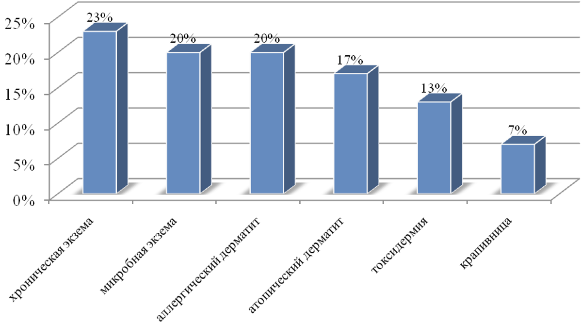 В исследование было включено 30 пациентов с аллергодерматозами в возрасте от 17 до 67 лет (17 мужчин и 13 женщин – 56,7 % и 43,3 % соответственно). Согласно клиническим и анамнестическим данным, хроническая экзема была выявлена у 7 (23 %) пациентов, аллергический дерматит у 6 (20%) пациентов, микробная экзема у 6 (20 %), атопический дерматит у 5 (17 %), токсикодермия у 4 (13%), крапивница у 2 (7 %) обследованных (рис.1).